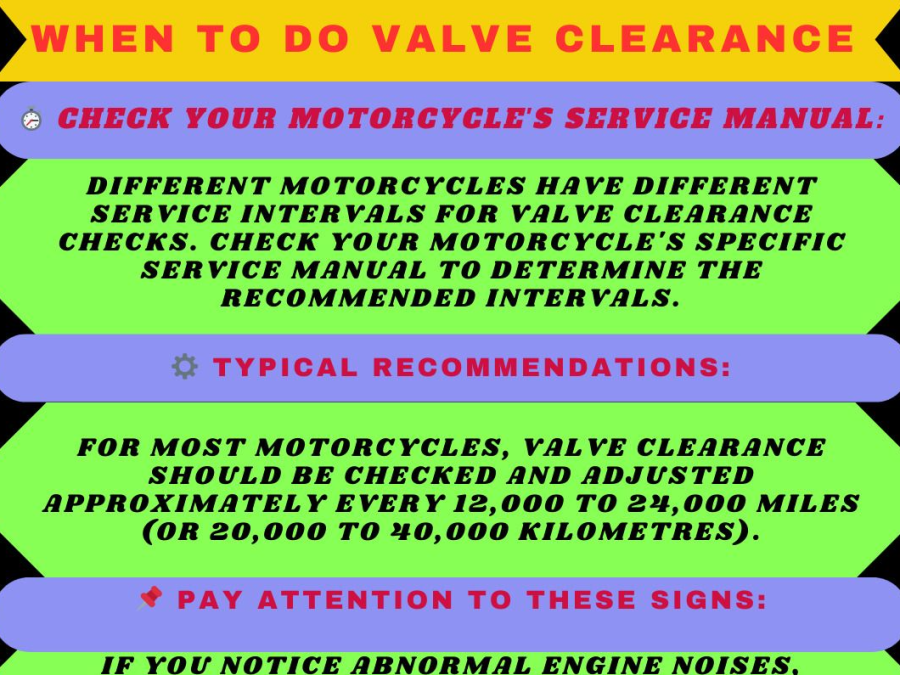 Different motorcycles have different service intervals for valve clearance checks. Check your motorcycle's specific service manual to determine the recommended intervals.